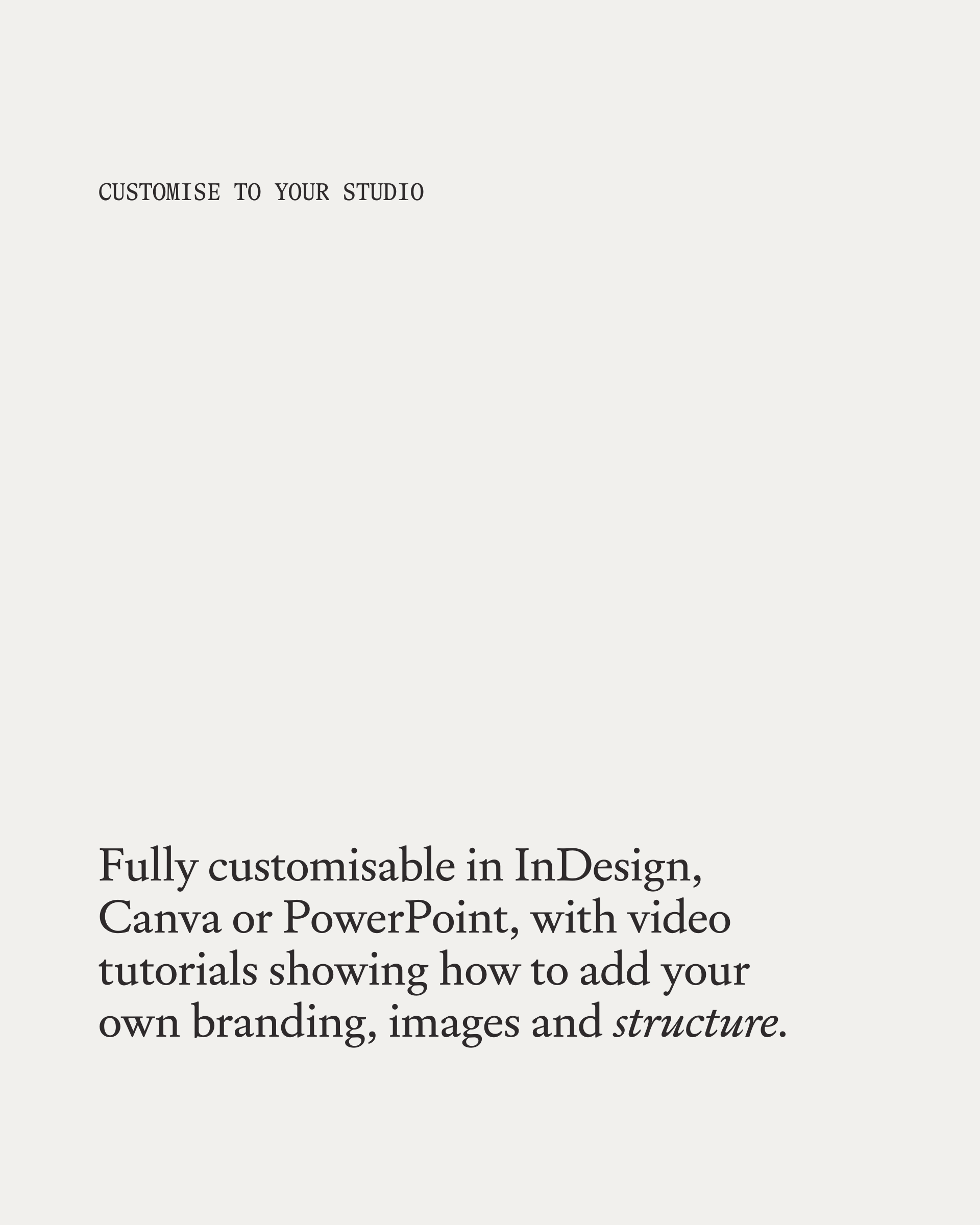 Ces modèles sont compatibles avec Canva (version gratuite ou Pro), Adobe InDesign et PowerPoint. Chaque page est modifiable : vous pouvez ainsi adapter les polices, les couleurs, les textes, les logos et les images à votre studio sans avoir à tout recréer.