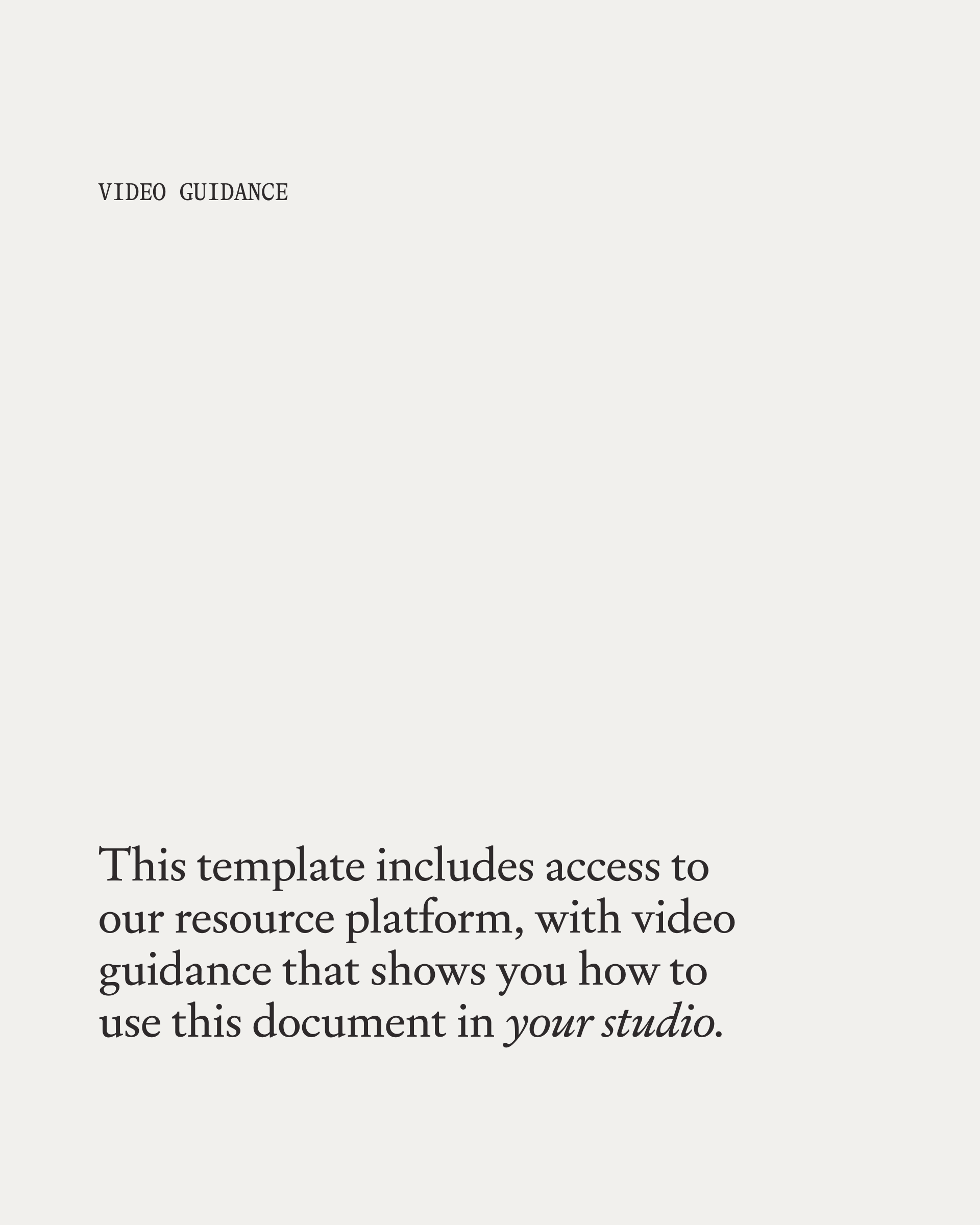 Deux séries d'ateliers vidéo accompagnent le fichier : l'une partageant nos recommandations sur la façon d'utiliser ce document au sein de votre studio, l'autre se concentrant sur la façon de le personnaliser pour qu'il corresponde à votre propre image de marque.