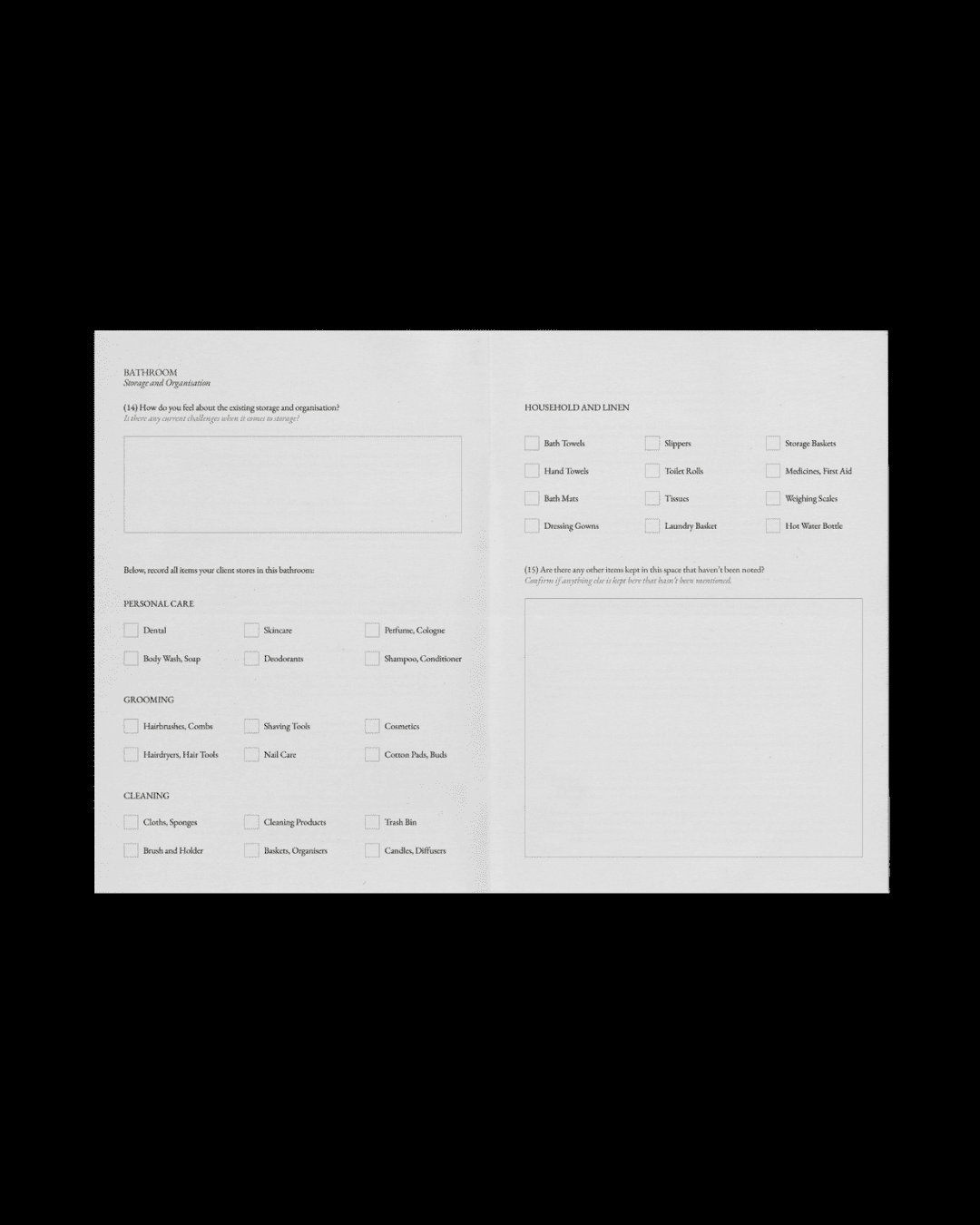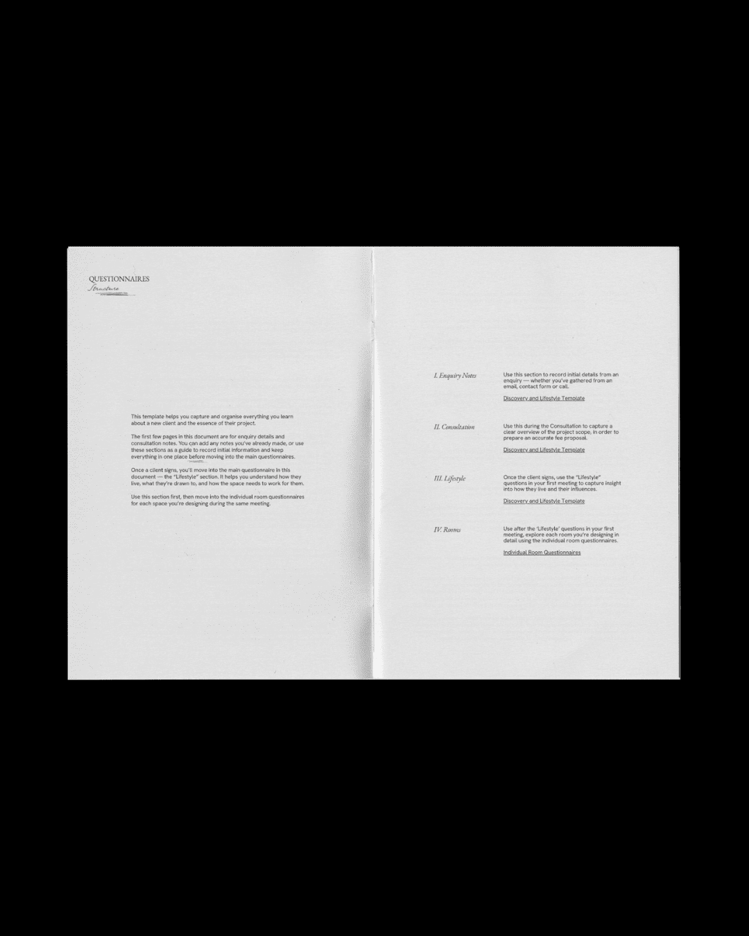Dans le modèle, les questionnaires sont organisés en notes de demande de renseignements et de consultation pour la phase initiale, et en une section sur le style de vie avec des questions spécifiques à chaque pièce pour une fois que le client a signé.