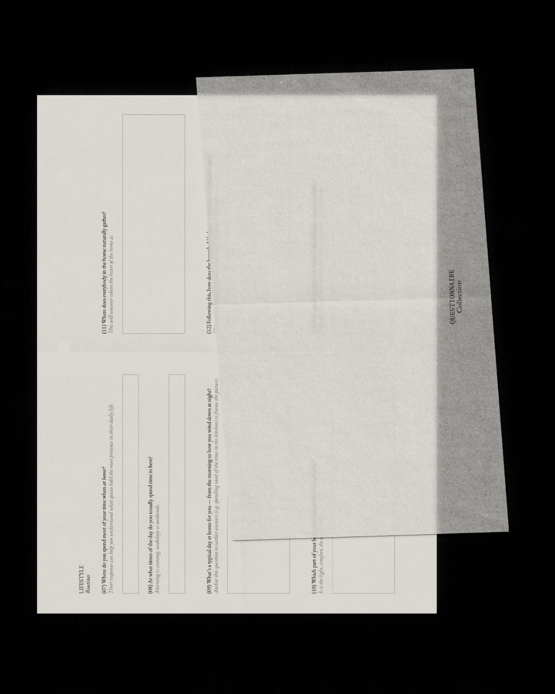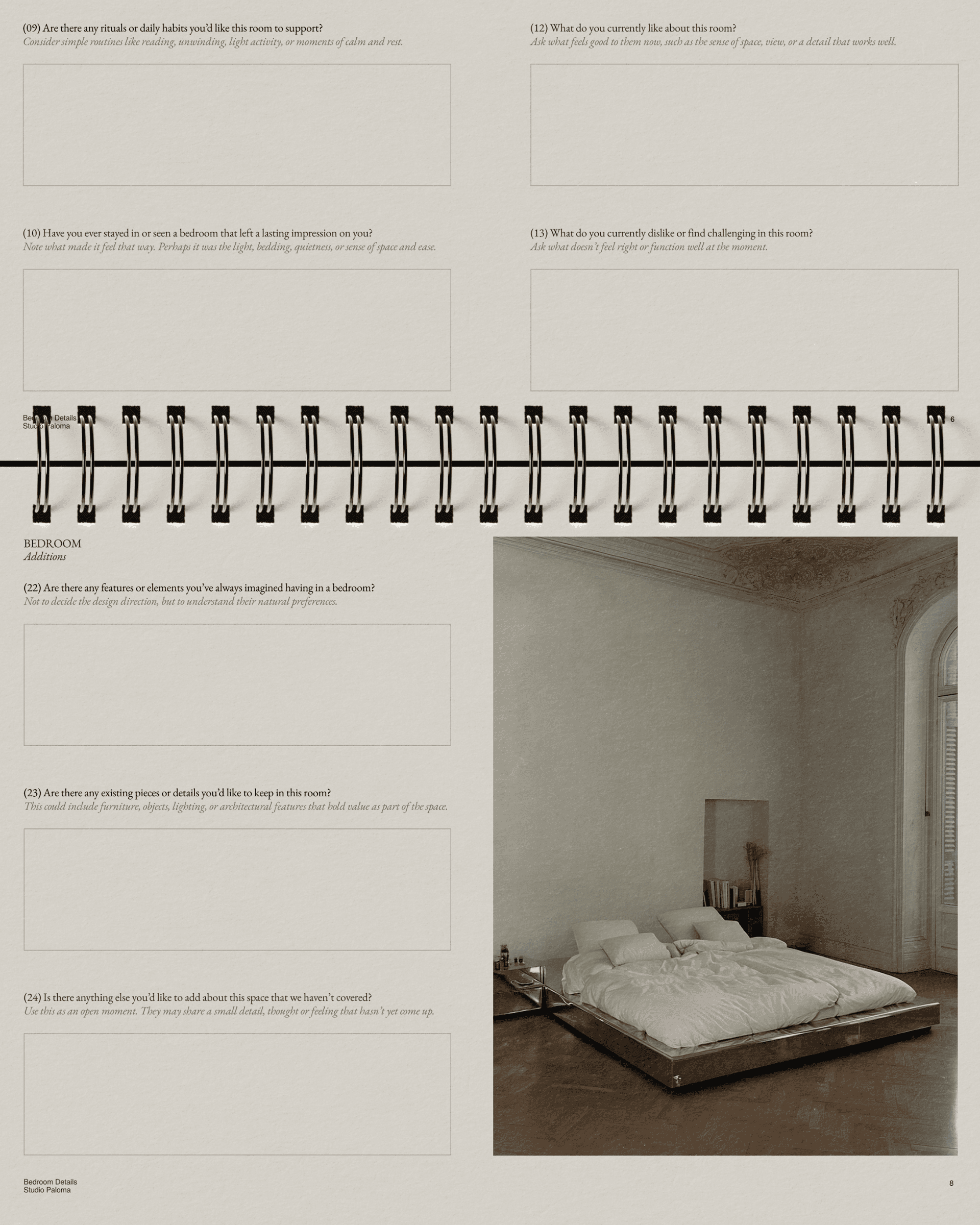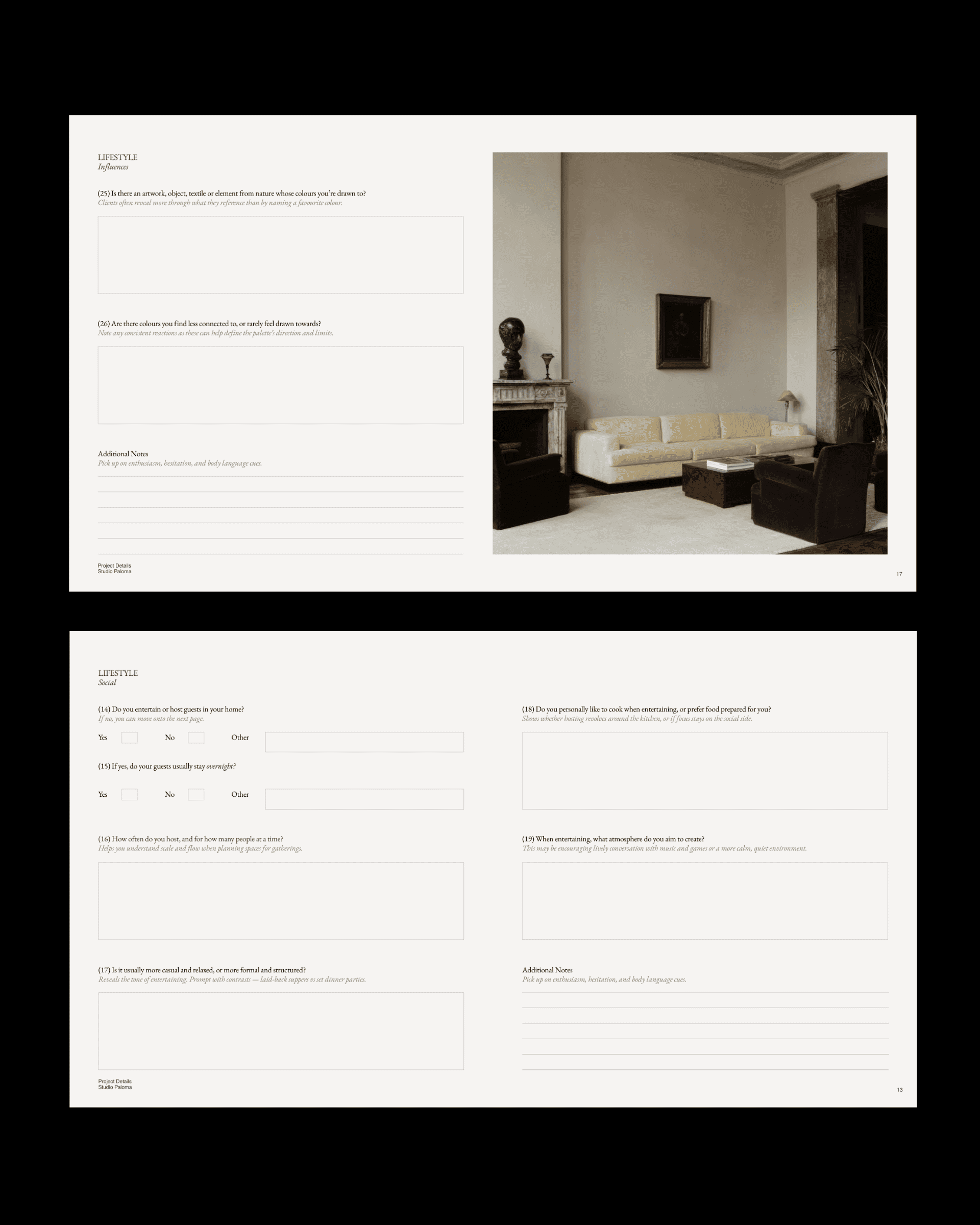 Les ateliers vidéo et les suggestions en page d'accompagnement montrent comment utiliser chaque question en pratique, ce qui donne moins l'impression de remplir un formulaire et plus celle d'avoir un cadre à portée de main, vous aidant à repérer les détails importants tout en adaptant la structure à votre propre studio. Découvrez comment nos questionnaires ont été compilés dans notre Notes de studio.