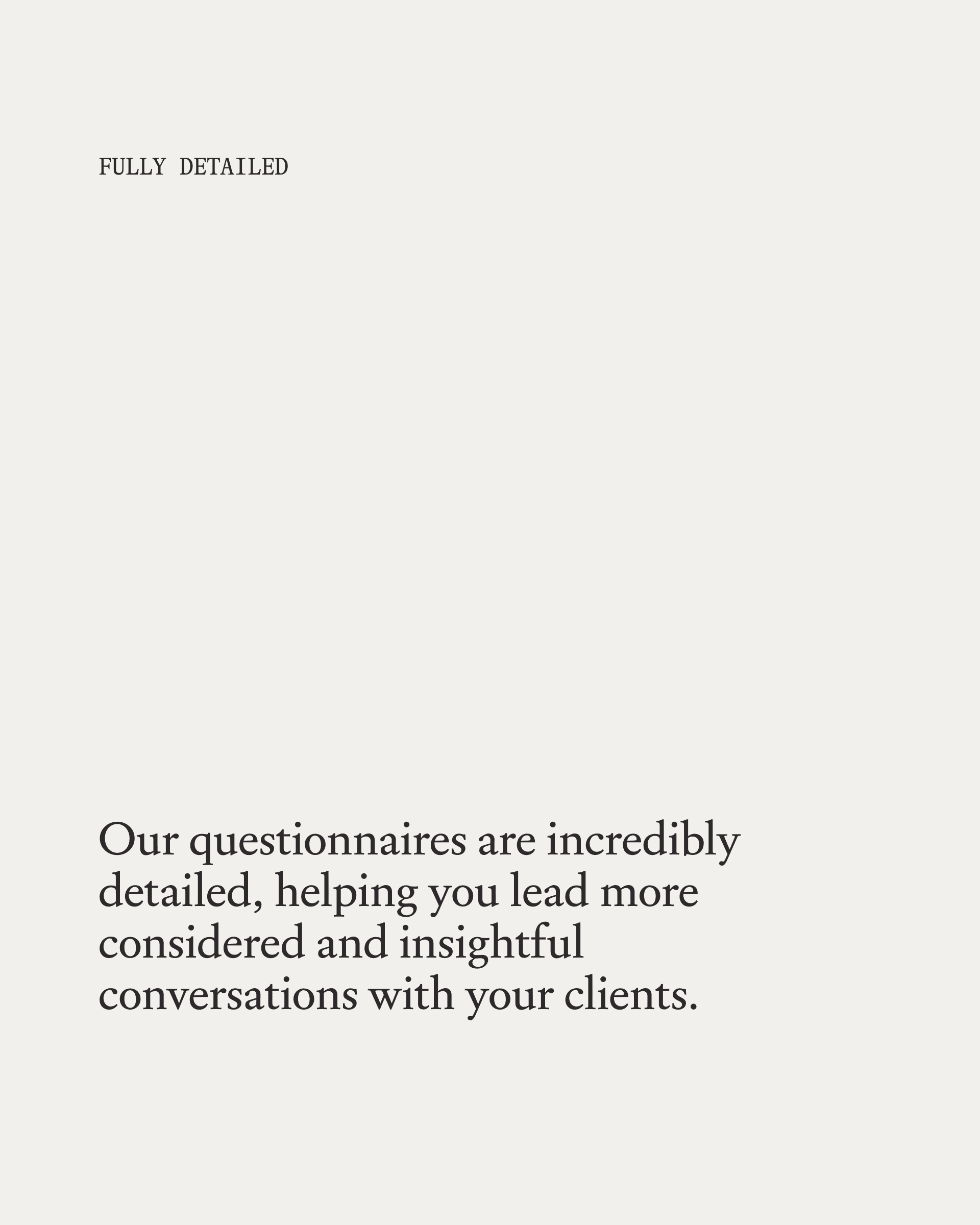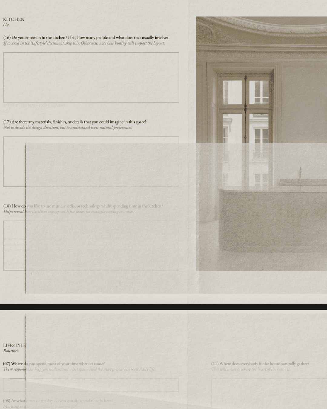 Les questions de consultation vous aident à recueillir les informations nécessaires à l'élaboration d'une proposition d'honoraires claire et précise. Une fois le contrat signé avec le client, les sections « Style de vie » et « Pièces » guident votre première séance de travail, vous fournissant ainsi tous les éléments pour concevoir une première ébauche réfléchie. Nos questions sont placées à côté des questions elles-mêmes, ce qui donne l'impression d'une conversation et non d'un formulaire.