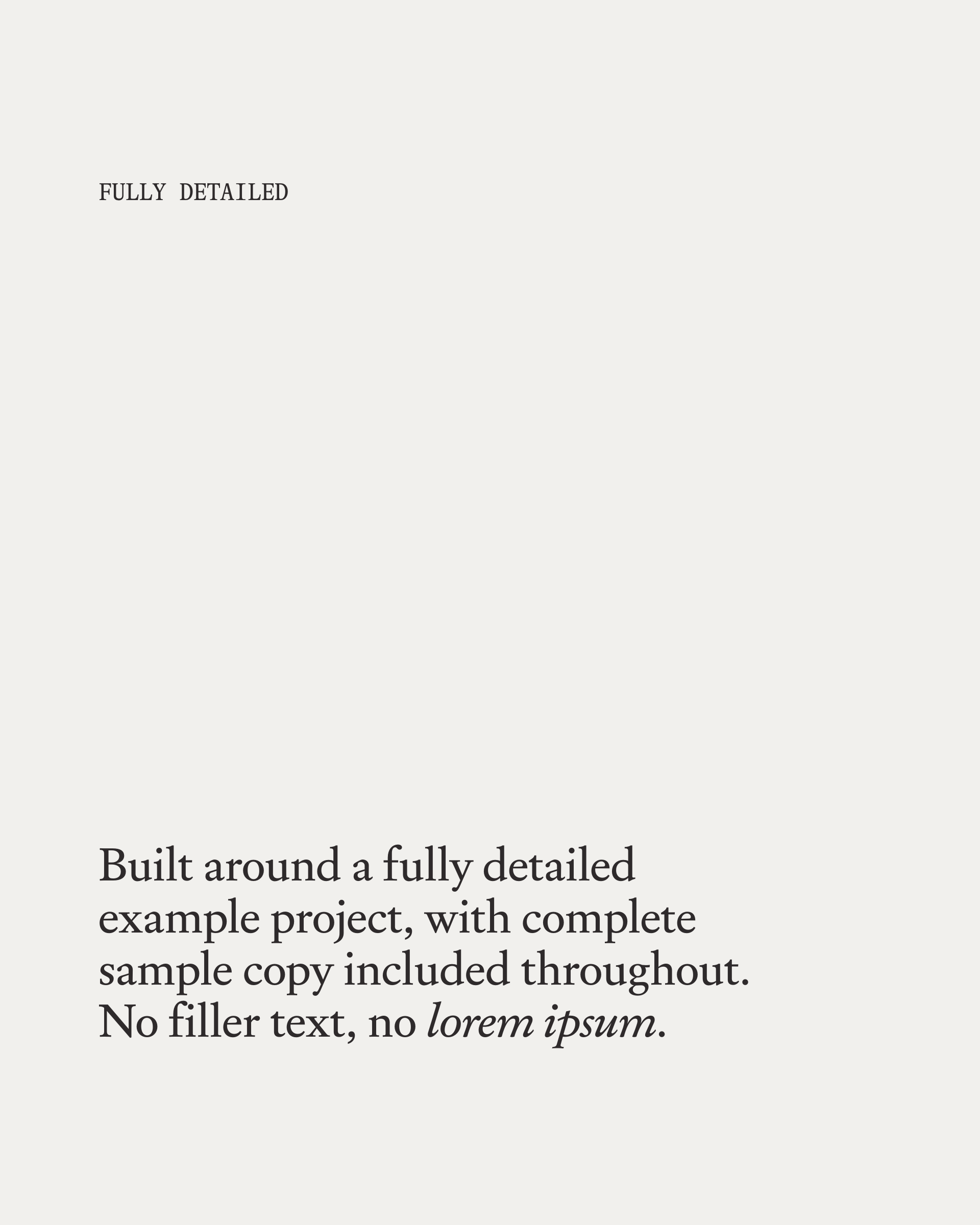 A fully realised example project and copy runs throughout, so you can see how a complete scheme can be presented using this document.