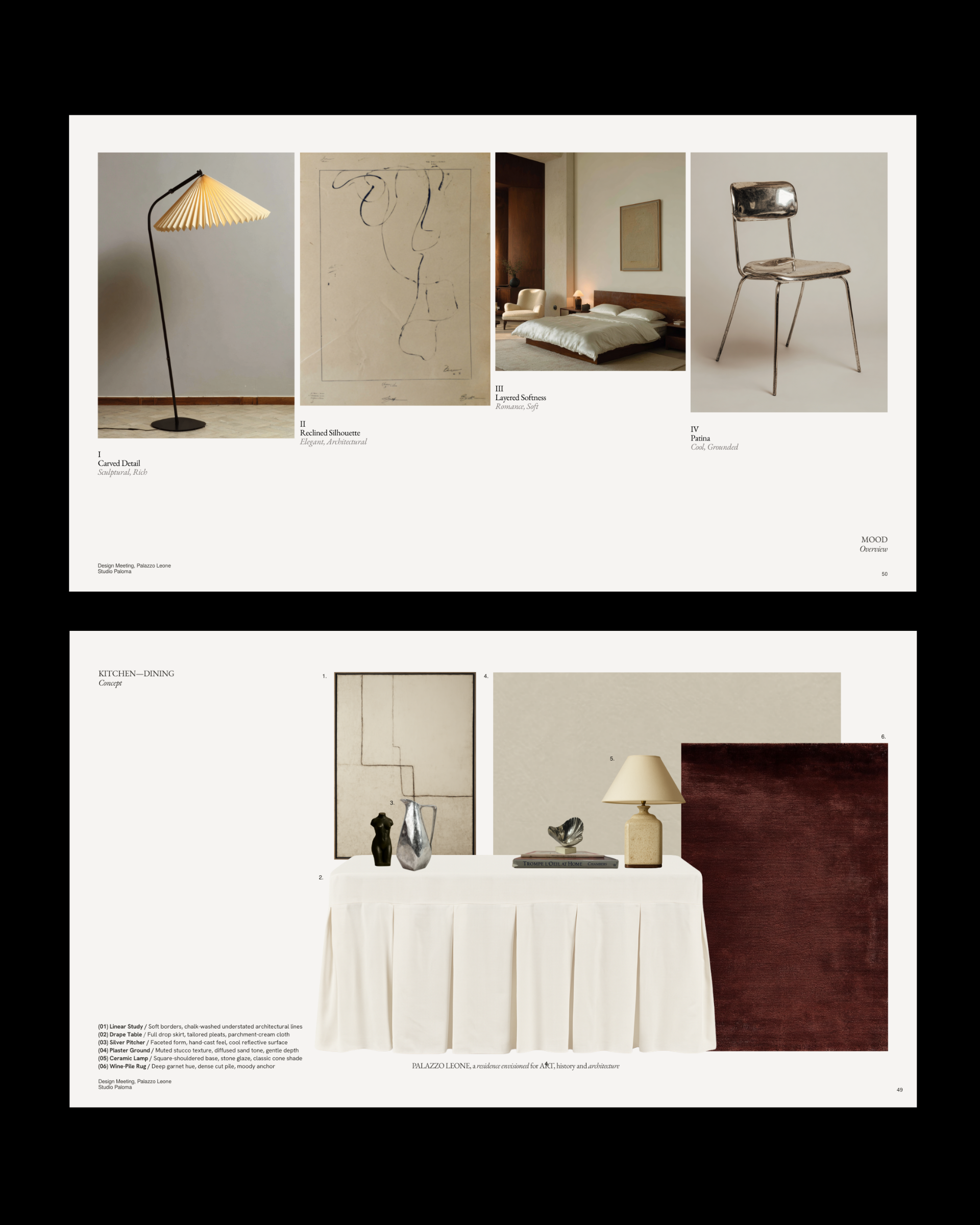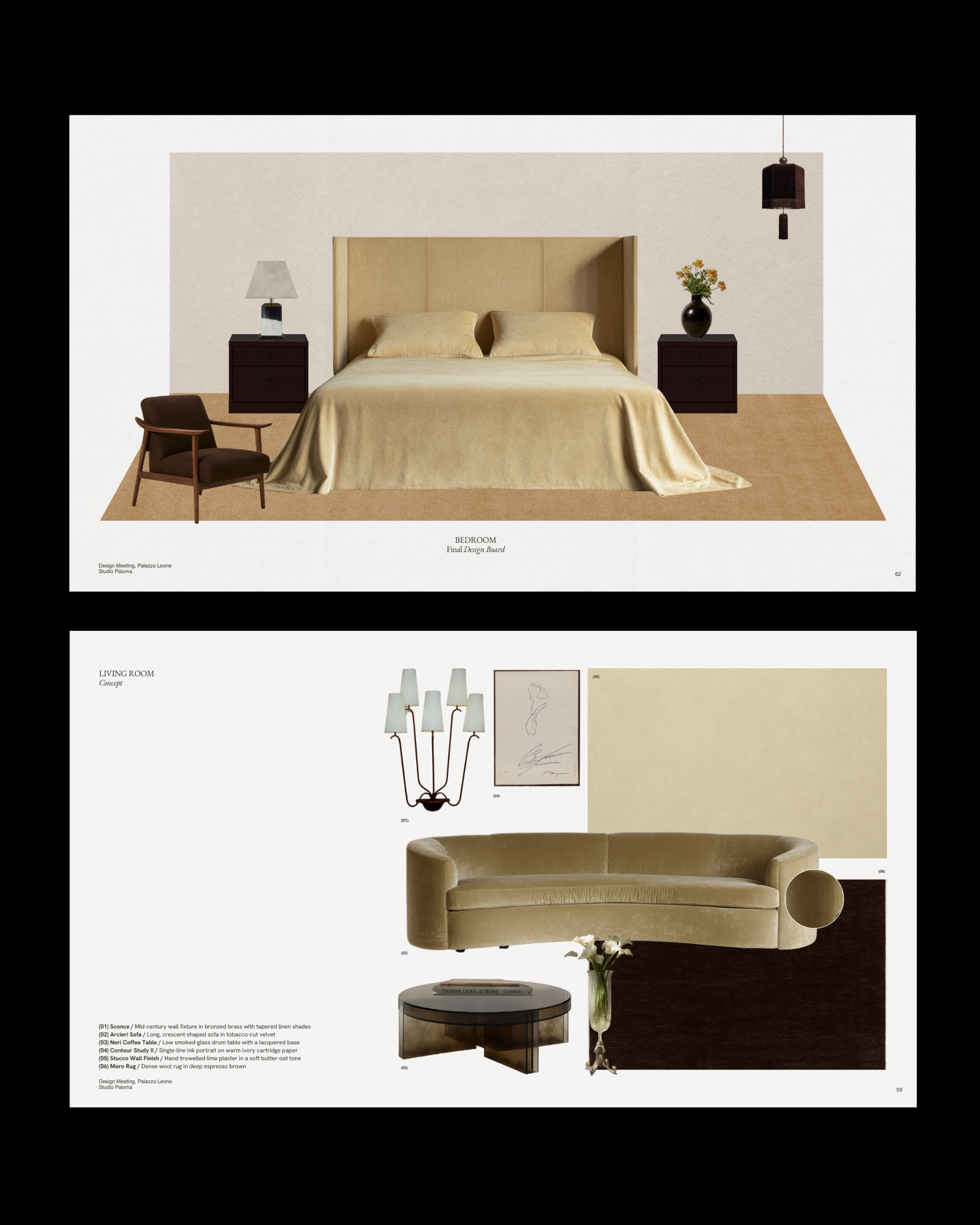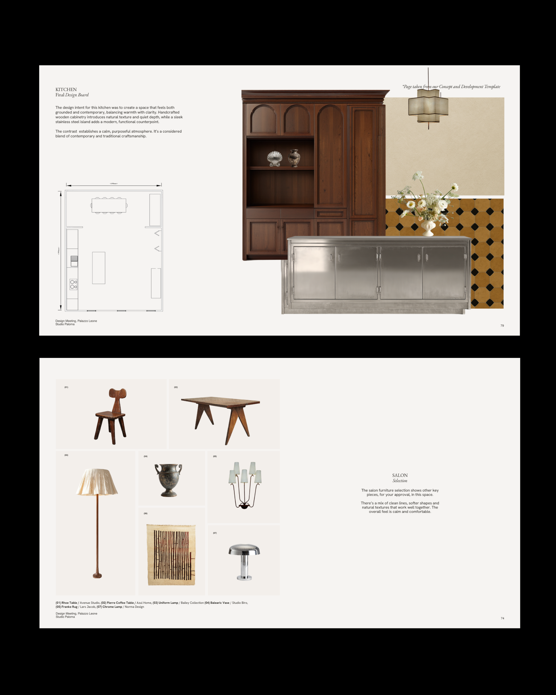 It’s structured around the key design meetings you hold with clients—moving from creative direction, mood and references through to analysis, spatial planning, concept, materials, specifications, and final room boards.