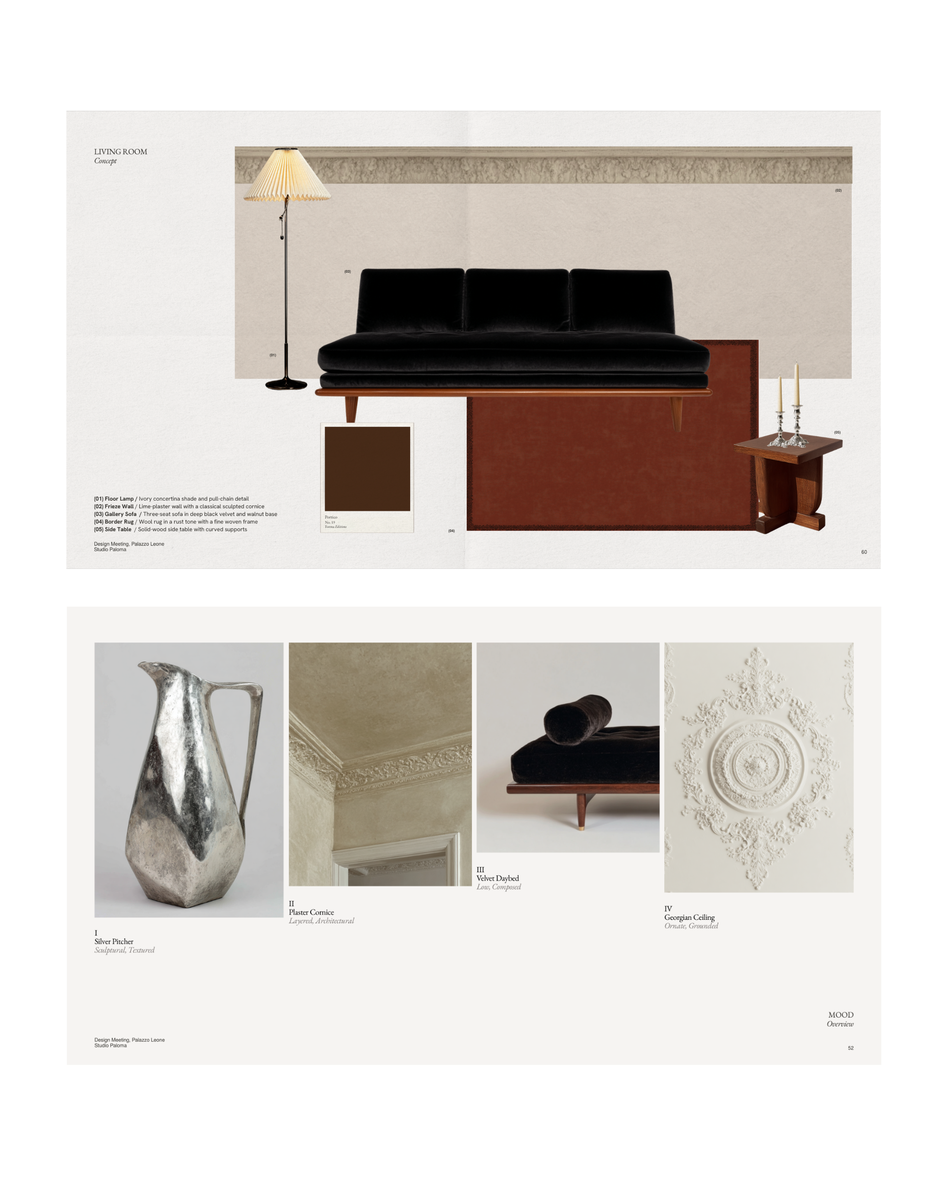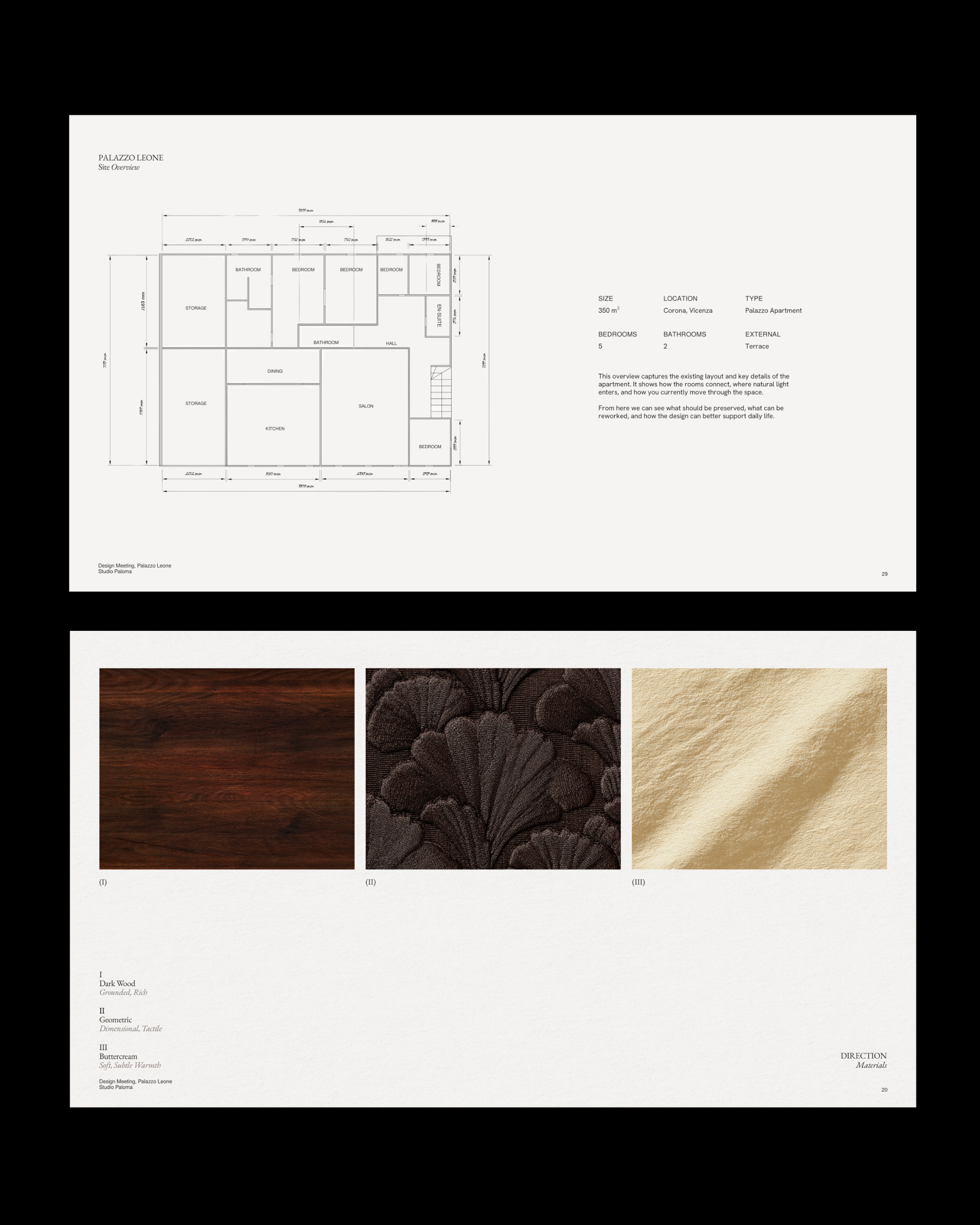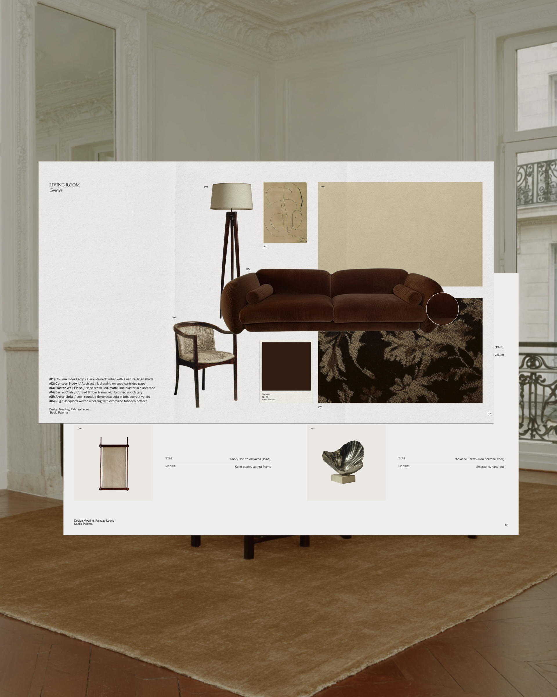 It’s structured around the key design meetings you hold with clients—moving from creative direction, mood and references through to analysis, spatial planning, concept, materials, specifications, and final room boards.
